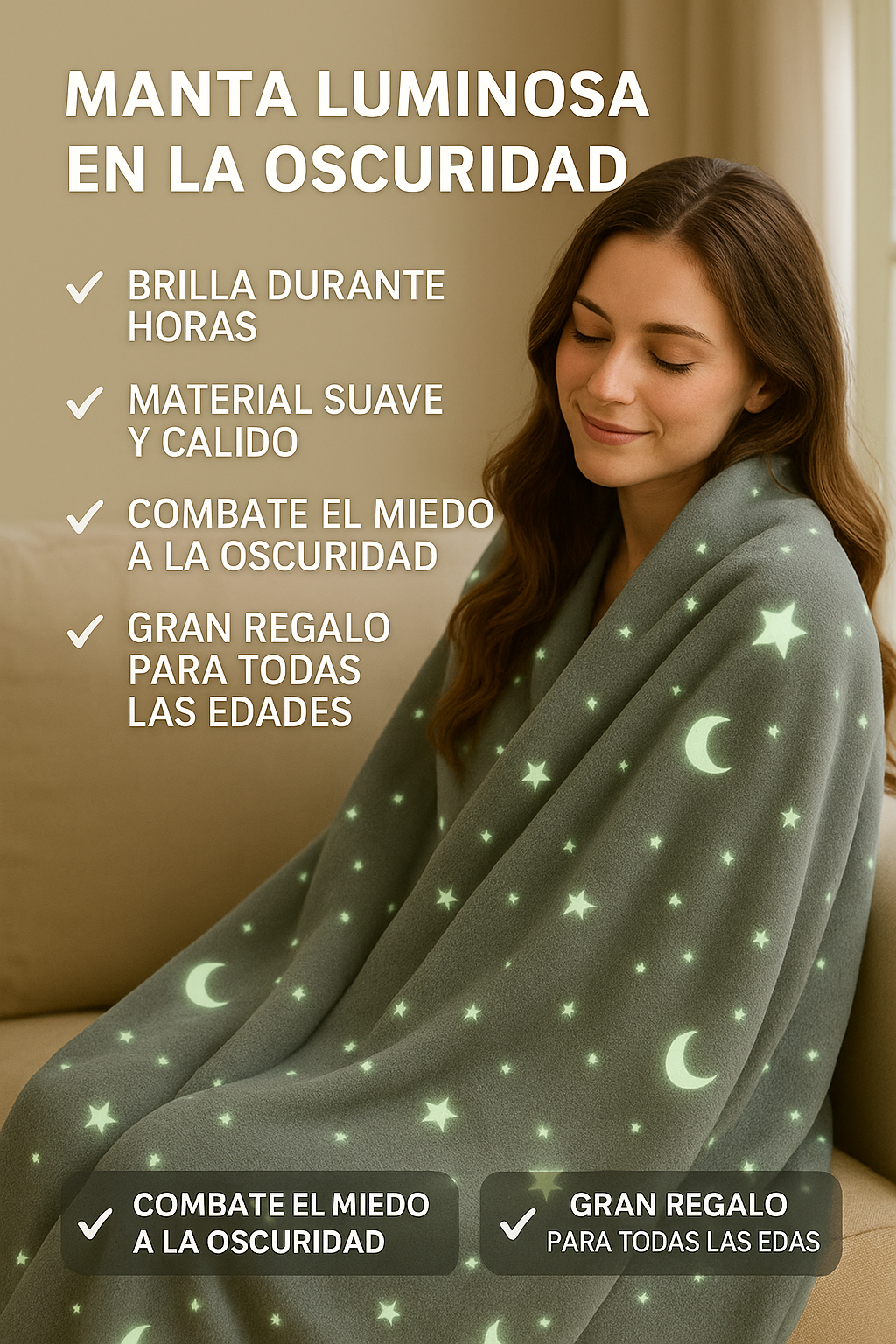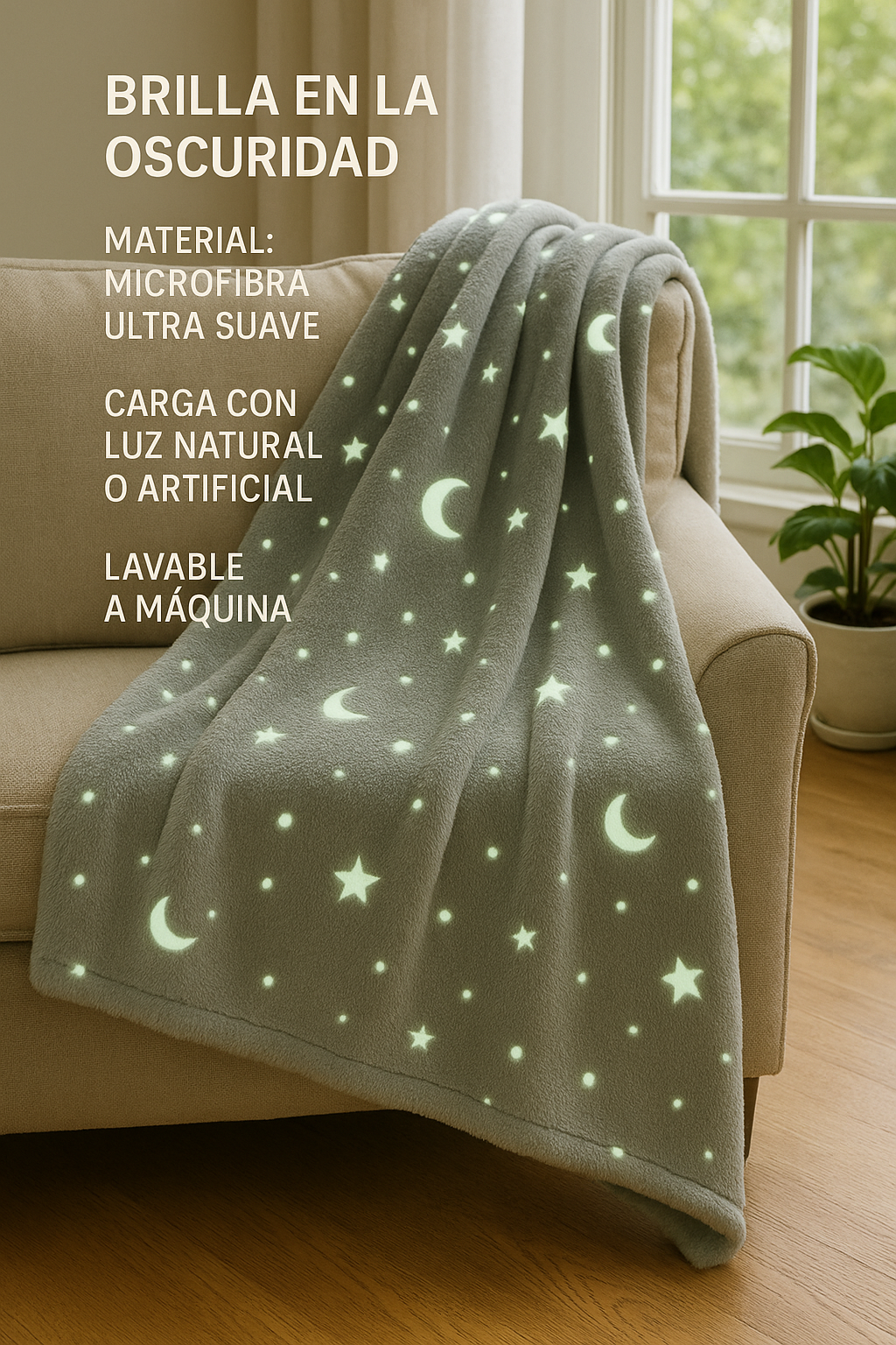 La Manta Luminosa Dreamling™ convierte cada noche en un momento mágico. Suave, cálida y con un diseño que brilla en la oscuridad, es perfecta para niños y adultos que buscan confort y un toque de fantasía. Solo necesita unos minutos de luz para cargarse y luego ilumina suavemente con estrellas y formas brillantes que acompañan el descanso. Ideal para regalar, decorar habitaciones y crear noches llenas de calma y encanto.