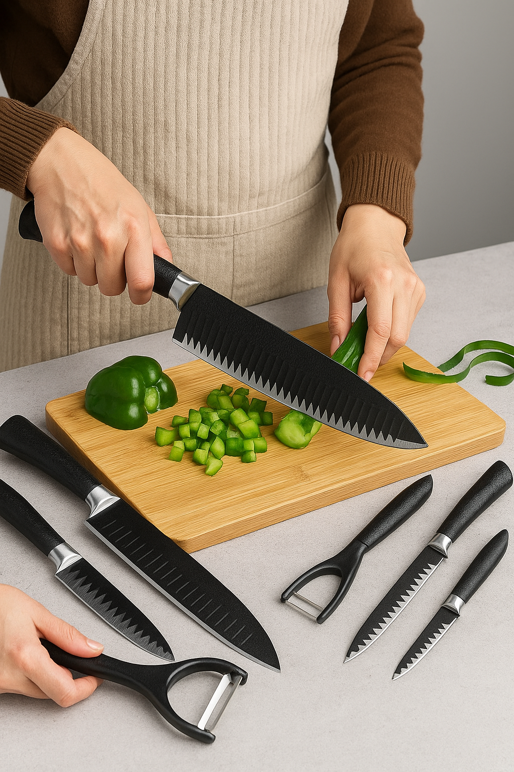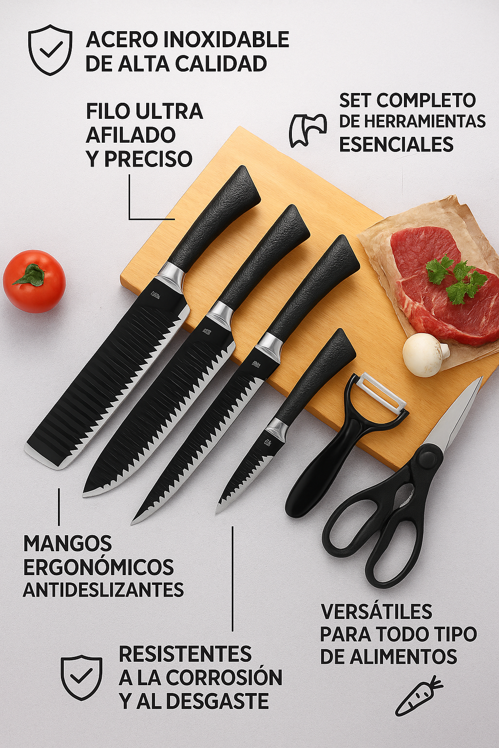 Un set completo con 6 herramientas esenciales fabricadas en acero inoxidable, con filo duradero y mangos ergonómicos antideslizantes. Permite cortar, picar, pelar y preparar todo tipo de alimentos con rapidez, precisión y estilo. Perfecto para cocinar como un profesional sin gastar de más.